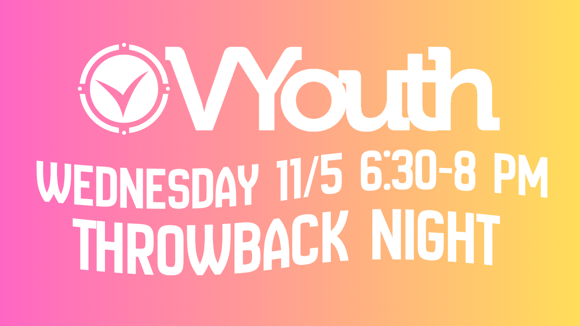 No VYouth this Sunday, November 2 (Hot Dog Fundraiser) or Sunday, November 9 (VCA Family Meeting, please come join us!). Instead VYouth Wednesday Night, November 5 6:30 PM – 8 PM Throwback Night!