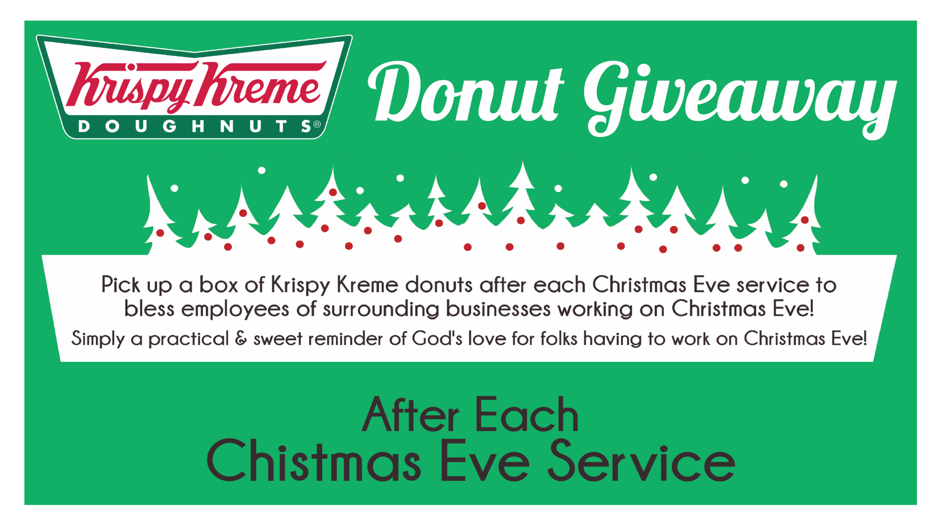 Pick up a box of Krispy Kreme doughnuts after each Christmas Eve service to bless employees of surrounding businesses working on Christmas Eve!   Simply